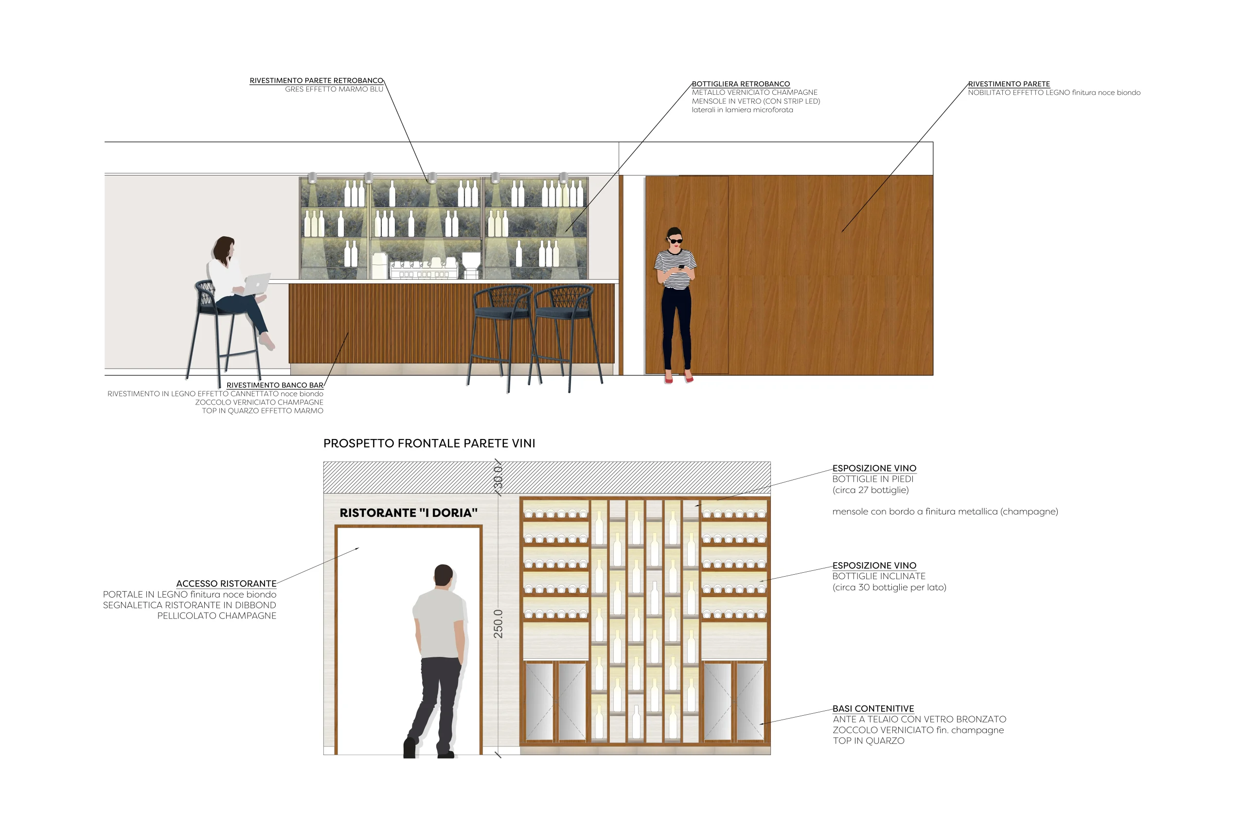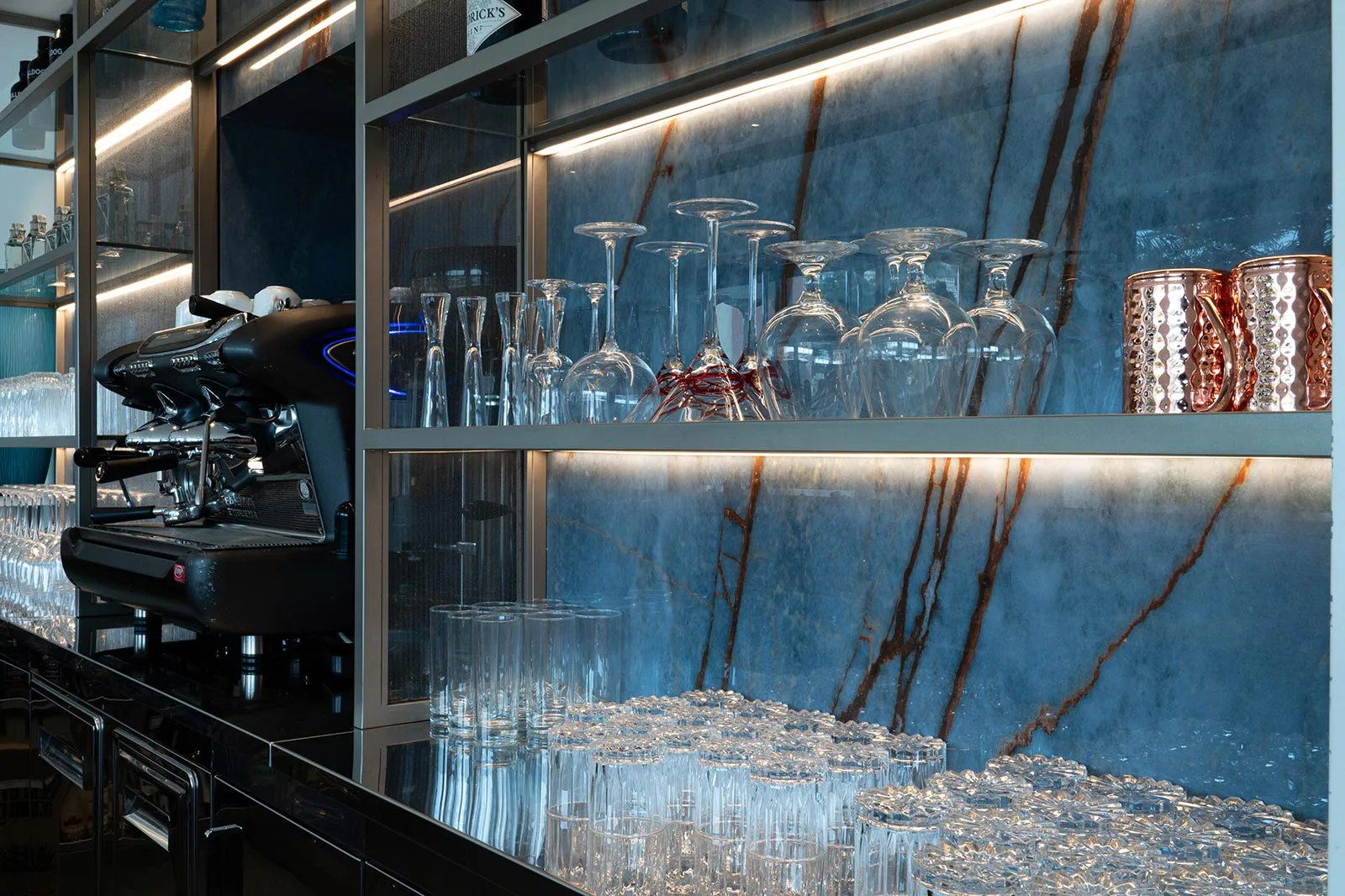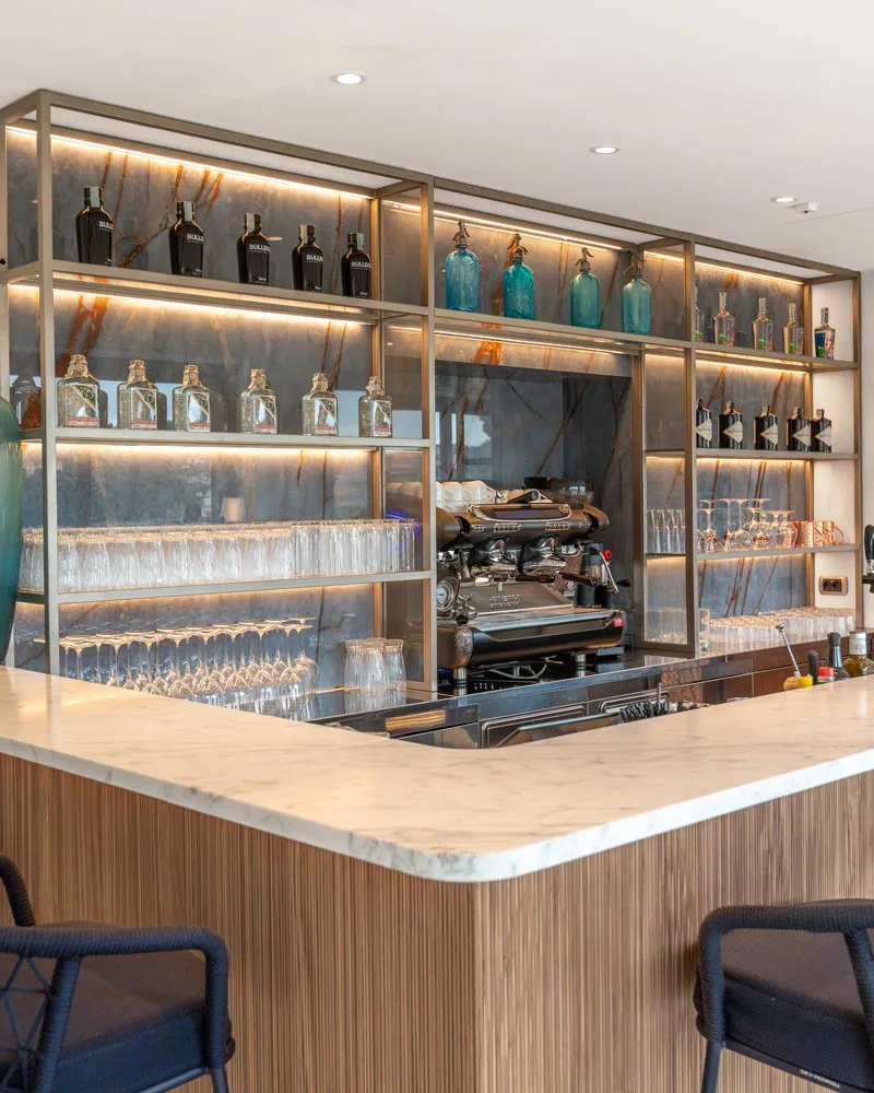 Linee pulite e una palette neutra, arricchita da accenti di blu, si uniscono per evocare il fascino del mondo navale in un ambiente elegante e armonioso. La luce naturale, che inonda lo spazio attraverso le ampie vetrate, si fonde con un’illuminazione studiata ad hoc, capace di creare atmosfere su misura per ogni momento della giornata. Materiali naturali come legno e marmo, insieme a dettagli preziosi in metallo e vetro, impreziosiscono ogni angolo della hall e della lounge bar. Gli specchi nella reception riflettono l’ambiente esterno, amplificando la sensazione di uno spazio raffinato e accogliente, perfetto per immergersi nel cuore del Golfo dei Poeti.